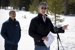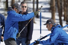 Gov. Gavin Newsom had to wear snowshoes to follow a measuring crew across a meadow south of Lake Tahoe at Phillips Station, where in April 2015 predecessor Jerry Brown stood in a parched, brown field and ordered cities to cut water use by 25% due to drought.
