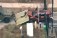 Video from the scene and a photo filed in court show a reddish-orange SUV with its hood crumpled against the barrier just inside the front gate.