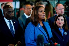 FILE - New York Attorney General Letitia James, center, flanked by Buffalo Mayor Byron Brown, left, and New York Gov. Kathy Hochul, speaks with members of the media during a news conference near the scene of a shooting at a supermarket, in Buffalo, N.Y., May 15, 2022. (AP Photo/Matt Rourke, File)   (Associated Press)