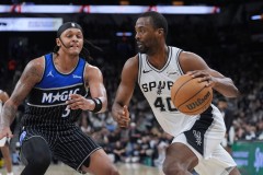 San Antonio Spurs forward Harrison Barnes (40) drives against Orlando Magic forward Paolo Banchero (5) during the second half of an NBA basketball game in San Antonio, Sunday, Feb. 1, 2026. (AP Photo/Eric Gay)   (Associated Press)