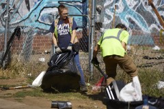 Angelique Risby, 29, watched as workers in neon-yellow vests shoveled piles of litter into black garbage bags. Risby, who has been homeless for two years, said she was prepared for a drill she's done multiple times.