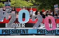 Booker's campaign outfitted its tables of supporters with light-up campaign signs, which they waved in the air to show off one of the biggest crowds in the ballroom as Booker spoke.