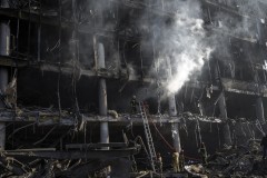 KYIV, Ukraine — Shelling in a Kyiv neighborhood has devastated a shopping center, leaving a flattened ruin still smoldering Monday morning in the midst of high-rise towers.