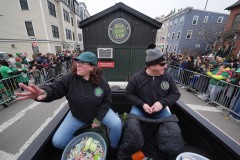 Dena Taylor, left, and Tony DiDonato toss candy to spectators while riding in a truck hauling the "Wee Irish Pub", a fully functioning mobile Irish pub built by two Massachusetts' brothers, during the annual St. Patrick's Day parade through the South Boston neighborhood, Sunday, March 15, 2026. (AP...   (Associated Press)