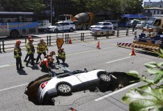 The conditions of the injured victims weren’t immediately known. Traffic in the Seondaemun area continued to be restricted as of Thursday evening as workers and officials repaired the damaged road and investigated the cause of the sinkhole.