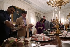 An impressive — and highly unusual — White House smorgasbord greeted the players. Silver trays held stacks of wrapped burgers from Wendy's. Also on offer were boxed burgers from McDonald's, including Big Macs.