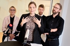 FILE - Caroline Stage, Danish Minister for Digitalization and representatives from the agreement parties attends a press conference about a new political agreement for better protection of children and young people online, in Copenhagen, Friday, Nov. 7, 2025. (Thomas Traasdahl/Ritzau Scanpix via AP,...   (Associated Press)