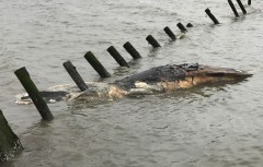 Marine Education, Research and Rehabilitation Institute Executive Director Suzanne Thurman says a decomposing whale washed into shallow water in the Delaware Bay recently, but weather is hampering efforts to study it. Thurman says it apparently was a juvenile humpback. If confirmed, it would be the fourth stranded in Delaware waters in a year, an unusually high number.