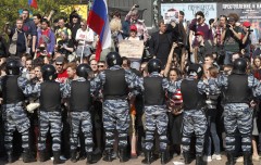 Police in riot gear waded into the crowd on Pushkin Square and were seen grabbing some demonstrators and leading them away, but there were no immediate moves to disperse the unauthorized gathering. A helicopter hovered overhead to monitor the crowd.