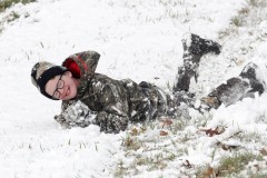 "It's beautiful," said Tim Moss, while his two sons and wife threw snowballs at each other near a McDonald's parking lot early Saturday. He said the family — including his mother — made a spontaneous decision late Friday to leave 80-degree weather in Florida and drive seven hours to see snow for the first time.
