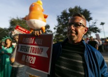 About 200 anti-Trump protesters rallied on a street outside the BB&T Center before the president arrived, raising a helium-filled “Baby Trump” balloon as some chanted, “Lock him up.”