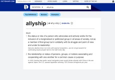 The site offers two definitions for allyship: The role of a person who advocates for inclusion of a “marginalized or politicized group” in solidarity but not as a member, and the more traditional relationship of “persons, groups or nations associating and cooperating with one another for a common cause or purpose.”