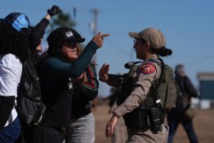 Protesters yell at a Texas state trooper outside the South Texas Family Residential Center detention facility where Liam Ramos and his father are being detained in Dilley, Texas, Wednesday, Jan. 28, 2026. (AP Photo/Eric Gay)   (Associated Press)