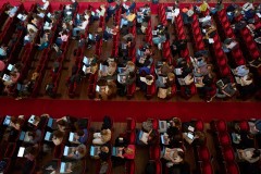 As the musicians played, more students wandered into the concert hall, some clutching cups of coffee along with their computers and books that they proceeded to perch on their laps. Signs advertise the password of the venue's free Wi-Fi network. A ticket for the session is just 2.50 euros ($2.85).