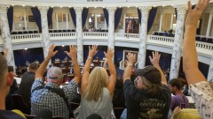 Bundy didn't respond to a reporter's shouted questions as he was wheeled into an elevator in a chair he apparently refused to get out of. At least two others were also arrested after police cleared the room, and they also refused to follow police commands to leave. Another person was taken into custody earlier in the same room where protesters shouted down lawmakers.