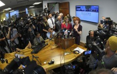 Griffin appeared surprised at the number of cameras and reporters in a packed conference room at her lawyer's office, her hands shaking at one point when she took a sip of water. She switched between contriteness to combativeness during the press conference, during which she attempted several nervous jokes that drew laughs mostly from her attorney, Lisa Bloom.