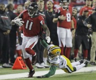 Rodgers had 287 yards with three touchdown passes and an interception. But the Falcons got to Rodgers with pressure and forced two Green Bay turnovers. Rodgers was outplayed by Ryan, who even ran for a 14-yard touchdown.