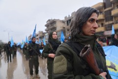 Female soldiers of the Kurdish-led, U.S.-backed Syrian Democratic Forces (SDF) march during a military parade in Qamishli, northeastern Syria, Sunday, Jan. 18, 2026. Syrian government forces have seized a strategic towns in eastern Syria, intensifying their push against Kurdish-led forces east of the...   (Associated Press)
