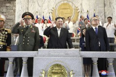 As the parade proceeded, Kim was constantly talking and exchanging smiles with Shoigu and Li, who respectively stood to his right and left at the balcony’s center. Kim and Shoigu repeatedly raised their hands to salute the parading troops. The broadcast did not show Kim making a speech.