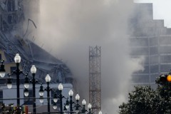 The fiery afternoon explosions sent up massive clouds of dust and sent one crane crashing to the street while the second fell in a way that left much of it resting atop the ruined hotel building where officials said it was "stable" and could be removed piecemeal.