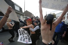 Around six topless Femen activists were detained Sunday morning after jumping out of an SUV limo wearing masks of Le Pen and United States President Donald Trump.