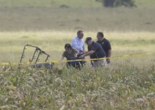 Saturday's crash happened at about 7:40 a.m. in a pasture near Lockhart, which is about 30 miles south of Austin. The land near the crash site is mostly farmland, with corn crops and grazing cattle. Cutting through that farmland is a row of massive high-capacity electrical transmission lines about 4 to 5 stories tall. The site of the crash appears to be right below the overhead lines, though authorities haven't provided further details about what happened. Aerial photos showed an area of charred pasture underneath power lines.