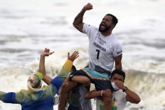 Hometown hero Kanoa Igarashi of Japan landed an incredible 360 aerial reverse on the beach he grew up on. The nearly-perfect maneuver sent him flying for seven seconds above the water and scored him a 9.33, enough to defeat Brazilian Gabriel Medina, the world’s top-ranked surfer.