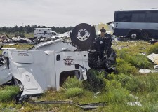 Preliminary information indicated the semi was headed east when it blew a tire, sending the rig across the median and into oncoming traffic where it smashed into the bus, New Mexico State Police said.