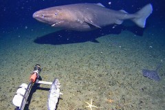 A skate appears in frame motionless on the seabed and seemingly unperturbed by the passing shark. The skate, a shark relative that looks like a stingray, was no surprise since scientists already knew their range extended that far south.