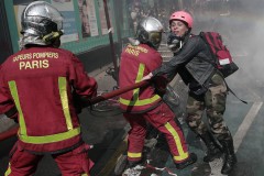 Tensions erupted in Paris, as some demonstrators smashed windows at some banks, a fast-food restaurant and a real estate agency, apparently partially the work of masked men dressed in black. French police moved in, firing rounds of tear gas. That failed to stop a woman from attacking a firefighter trying to douse a street fire.