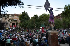 Police said the couple had heard a loud commotion in the street and saw a large group of people break an iron gate marked with “No Trespassing” and “Private Street” signs. The video showed the protesters walking through the gate and it was unclear when it was damaged.