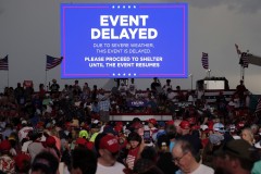 Speaking from his private plane, Trump cited lightning and the incoming storm in explaining that he would not be landing. He pledged to reschedule a “bigger and better” event at the same location “as quick as possible.”