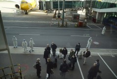 The rest of the team arrived at the Wuhan airport and walked through a makeshift clear plastic tunnel into the airport. The researchers, who wore face masks, were greeted by airport staff in full protective gear, including masks, goggles and full body suits.