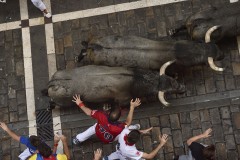 Another of the six bulls in the run got separated from the pack, did a U-turn and gored a nearby runner, lifting his body off the ground and flipping him over.