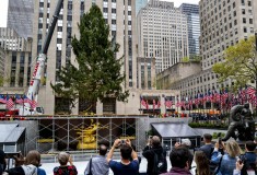 NEW YORK (AP) — An iconic sign of Christmas arrived in New York City on Saturday as a crane hoisted an 82-foot (25-meter) Norway spruce into place at Rockefeller Plaza, where the 14-ton tree will be festooned with thousands of lights and topped with a star encrusted with millions of crystals.