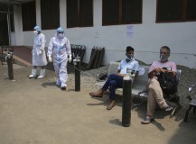 Indian television stations broadcast images of patients lying on stretchers outside hospitals waiting to be admitted, with hospital beds and critical oxygen in short supply. People infected with COVID-19 in villages are being treated in makeshift outdoor clinics, with IV drips hanging from trees.