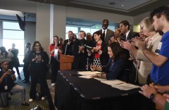 The signing took place on the Michigan State University campus in East Lansing, where a gunman killed three students and injured five others two months ago. Flanked by students and gun safety advocates, Whitmer, a graduate of MSU, told the more than 100 people in attendance to “buckle up, we’re going to continue this work.”