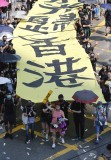 Many demonstrators tossed wads of fake "hell" bank notes usually used at funerals into the air. "The leaders who won't listen to our voice, this is for them," said marcher Ray Luk.