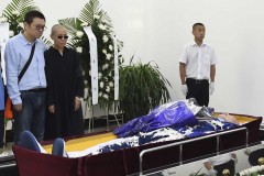 Handout images showed Liu Xia, who wore dark sunglasses, being comforted by her brother in a funeral parlor as they stood in a row with Liu's older and younger siblings and their wives. Liu's body lay in an open casket in the center of the room, surrounded by an arrangement of potted white flowers.