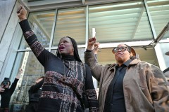 Dozens of supporters gathered outside the courthouse, chanting “Pam Bondi has got to go” and “Protect the press.”