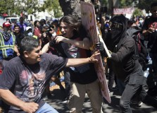 Separately, groups of hooded, black-clad protesters attacked at least four other men in or near the park, kicking and punching them until the assaults were stopped by police. The assaults were witnessed by an Associated Press reporter.