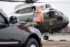 Trump sped by just before 7 p.m. on his way to attend a dinner with Australian Prime Minister Malcolm Turnbull aboard the USS Intrepid, a decommissioned aircraft carrier that is now a museum.