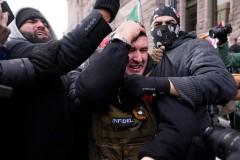 Jake Lang, center, who organized the protest March Against Minnesota Fraud, clutches his head as he leaves the rally near Minneapolis City Hall, Saturday, Jan. 17, 2026, in Minneapolis. (AP Photo/Yuki Iwamura)   (Associated Press)