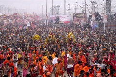 On Tuesday, millions thronged to the riverbanks, with some carrying clothes, blankets and food on their heads and others lugging wheeled bags. Entire families and groups of people from faraway villages marched in huge lines as security personnel blared warnings to avoid stampedes that have marred the festival in the past.