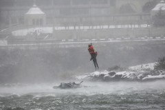 Video showed Duryea, in an orange suit and with an axe in his left hand, buffeted by winds and spraying water as he was lowered toward the car through falling snow. After slowly spinning and swinging past the car, he was able to grab hold on the passenger side, open the door and disappear inside.