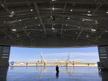 Behind the spaceport's signature wall of curved glass, mission control sits on the second floor with an unobstructed view of the runway and beyond.