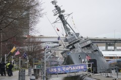 Crews were working to keep the USS The Sullivans from sinking at its berth at the Buffalo and Erie County Naval & Military Park, where it had been open for tours. Part of the leaning vessel's deck had dipped below the waterline by midday.