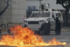 As night fell, a few thousand people were still gathered in a plaza in wealthy eastern Caracas as residents in nearby buildings banged pots and pans in a show of support. A group of youths with their faces covered tore down street signs and billboards for makeshift barricades. They then launched rocks and Molotov cocktails against lines of police and national guardsmen who responded with tear gas in cat-and-mouse skirmishes likely to last deep into the night.
