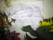 A handwritten note in purple ink was left with flowers Monday night at the base of a lifeguard stand at the beach.