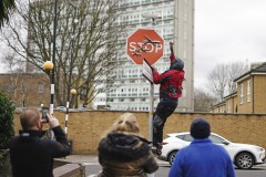 A red stop sign with three military drones on it was taken in the middle of the day by a man with bolt cutters as witnesses snapped photos and shot video in the Peckham section of south London.